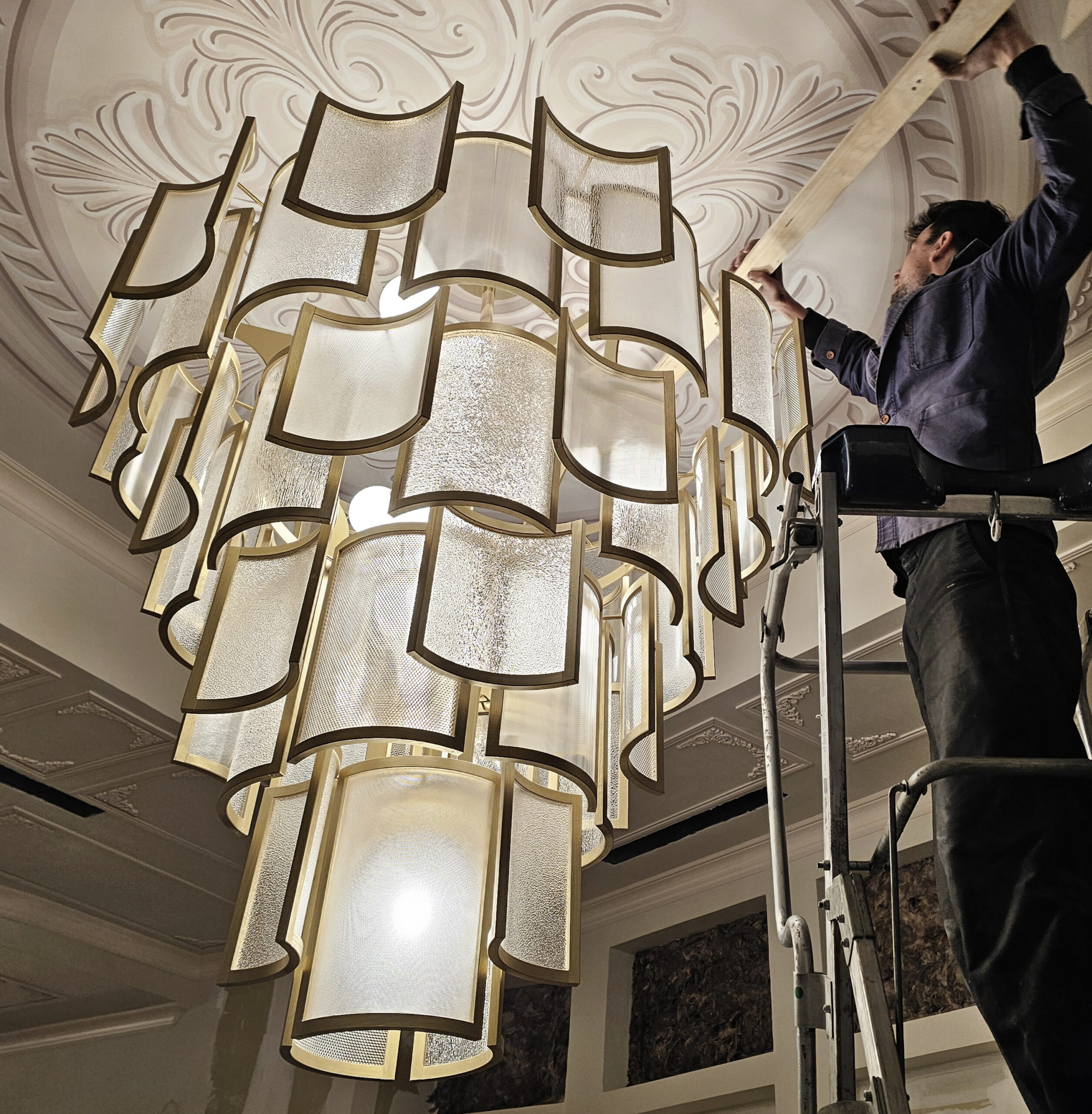 Elle découvre un jour un lustre que j’ai réalisé « LE CARROUSEL » et se demande si l’on peut trouver une alliance entre les deux. Les mots clefs à la source de ce luminaire sont « Légèreté », « équilibre » et « élégance».