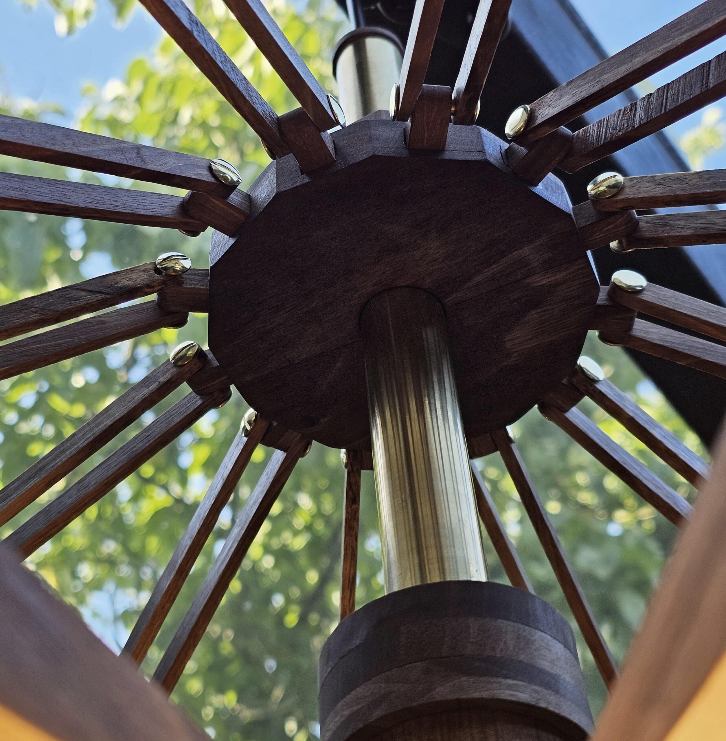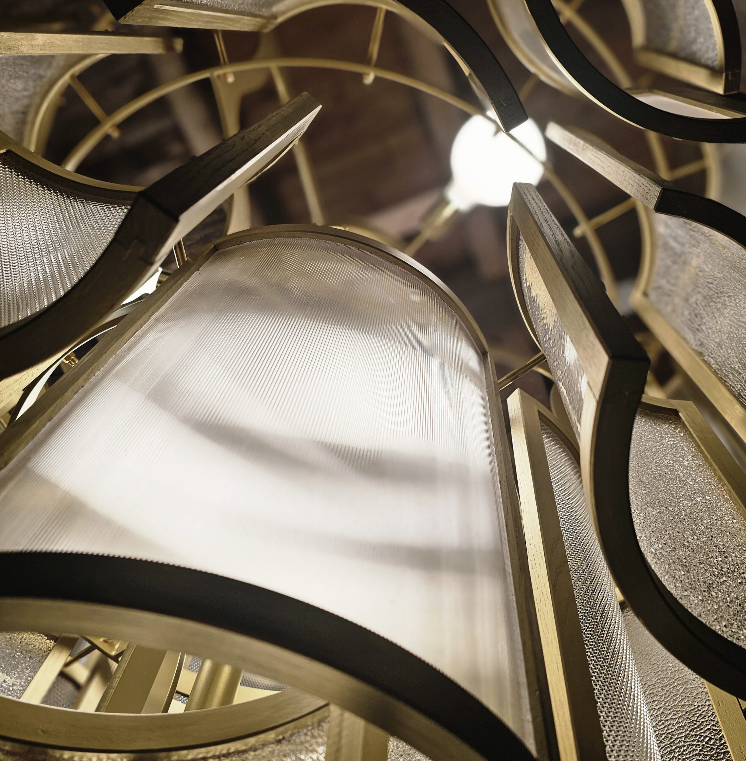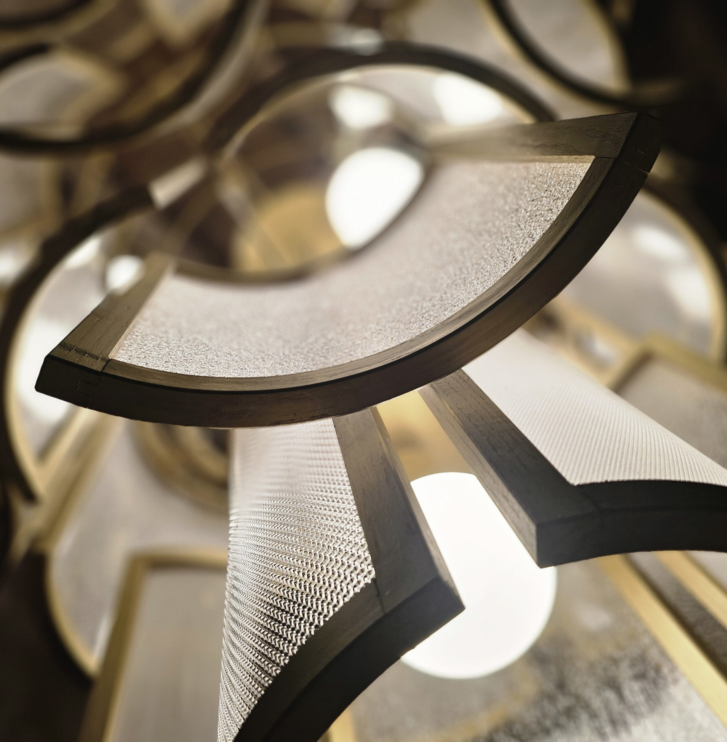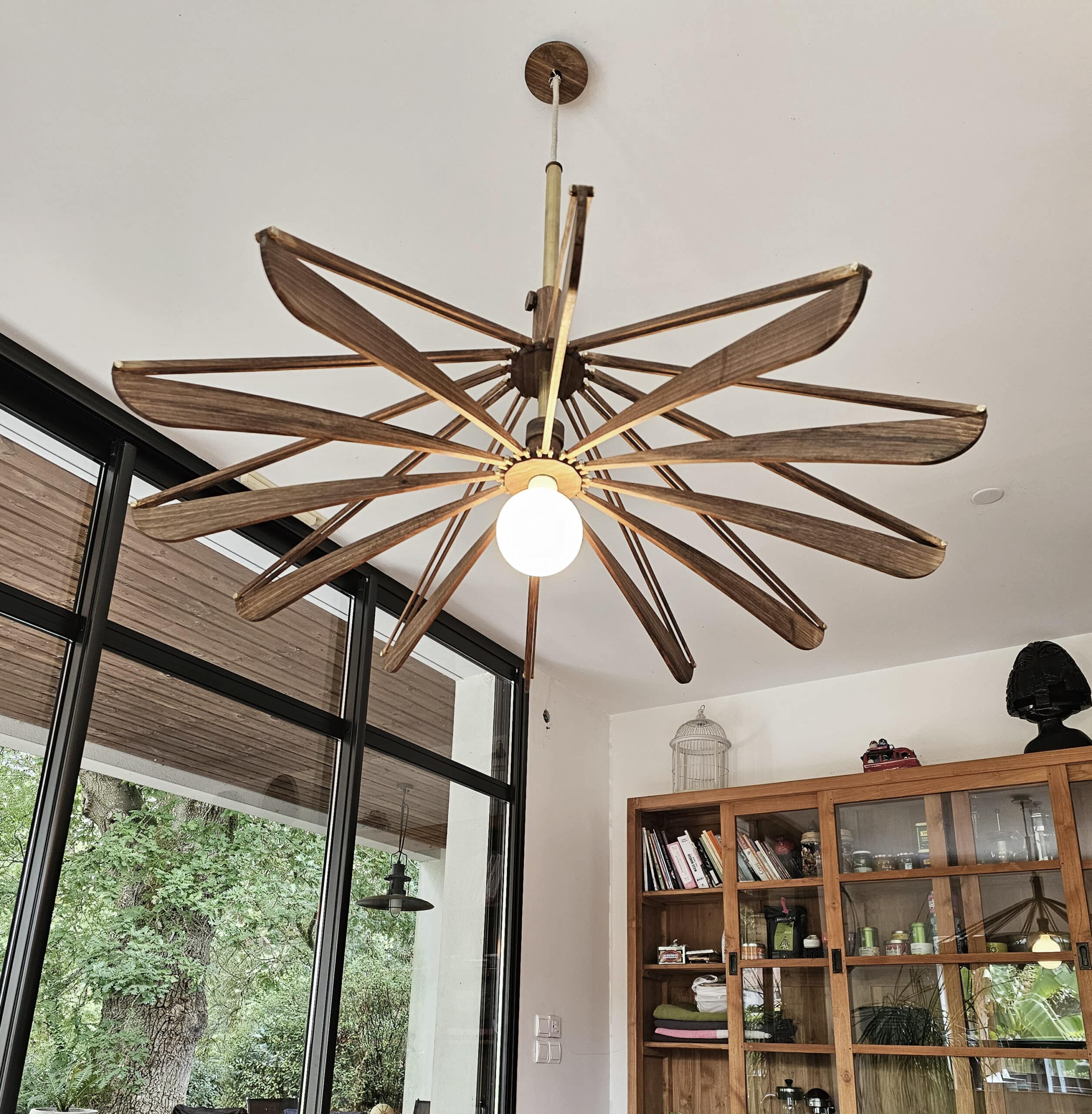Fait de Noyer et de Laiton, la fleur de Samare peut ouvrir ou fermer ses 12 pétales aux courbes douces en coulissant sur un tube central. Avec ses 140 cm de diamètre, elle enveloppe la table à manger. Le noyer, par sa teinte et son veinage unique, se charge de réchauffer la pièce.