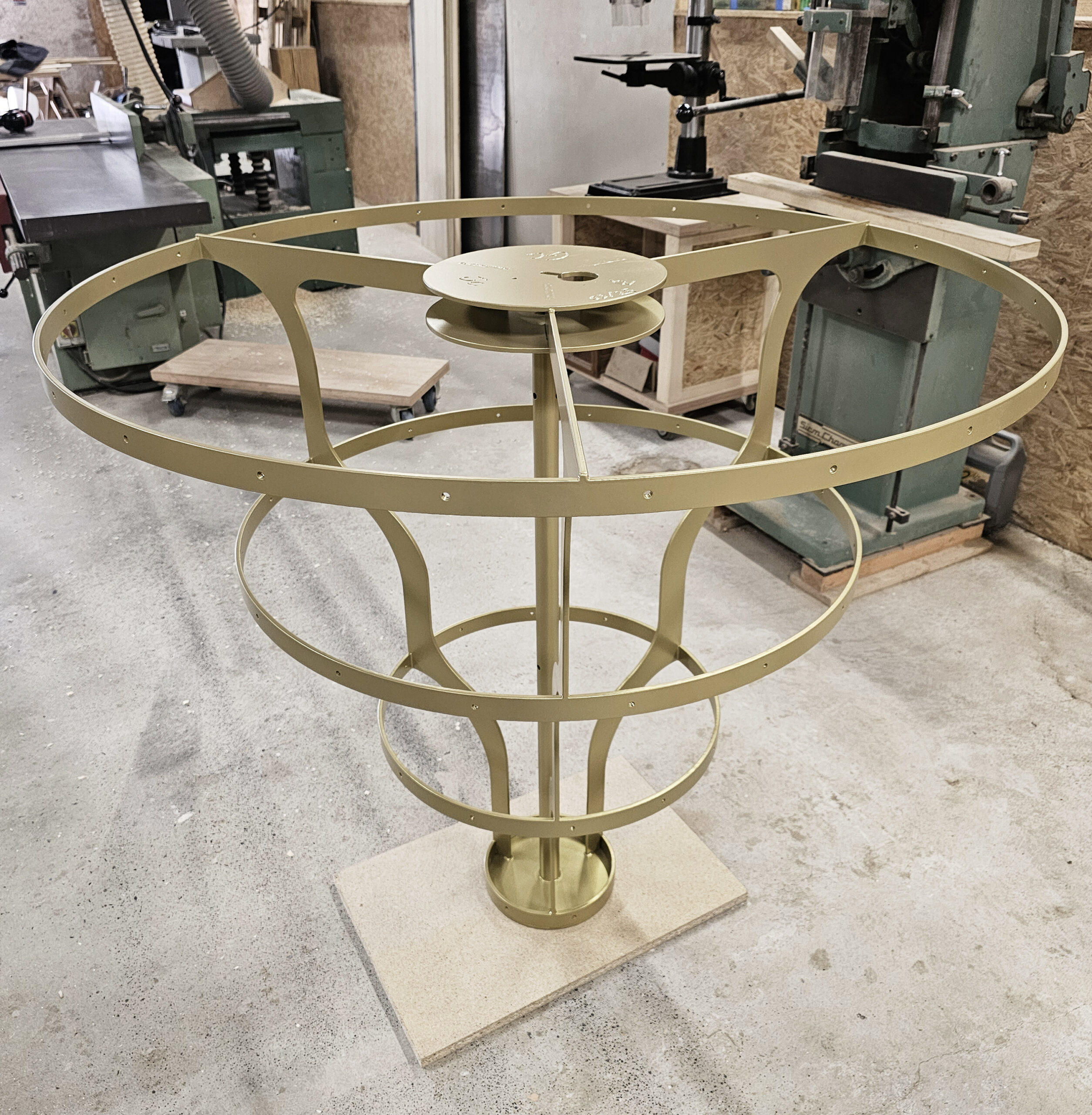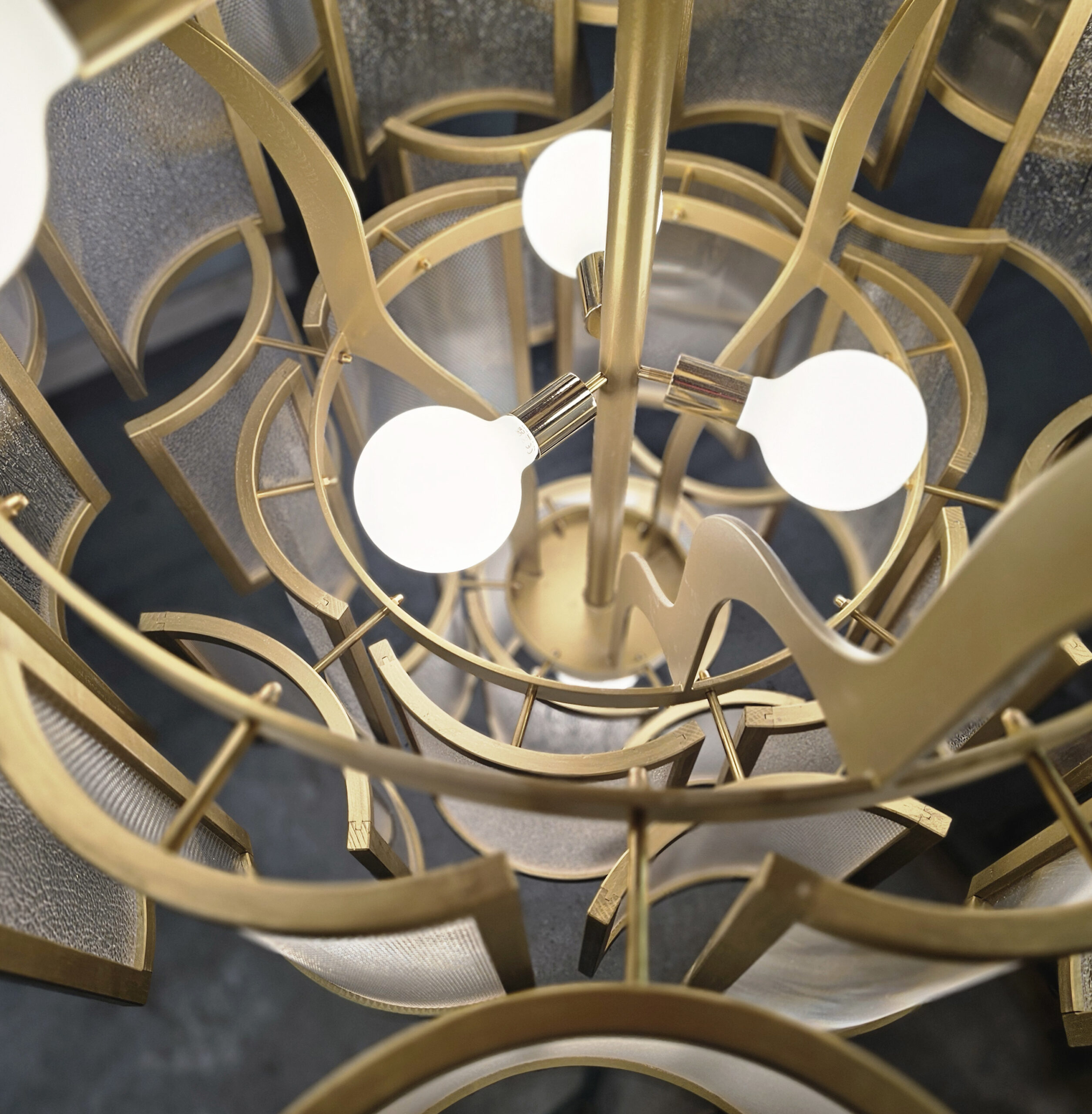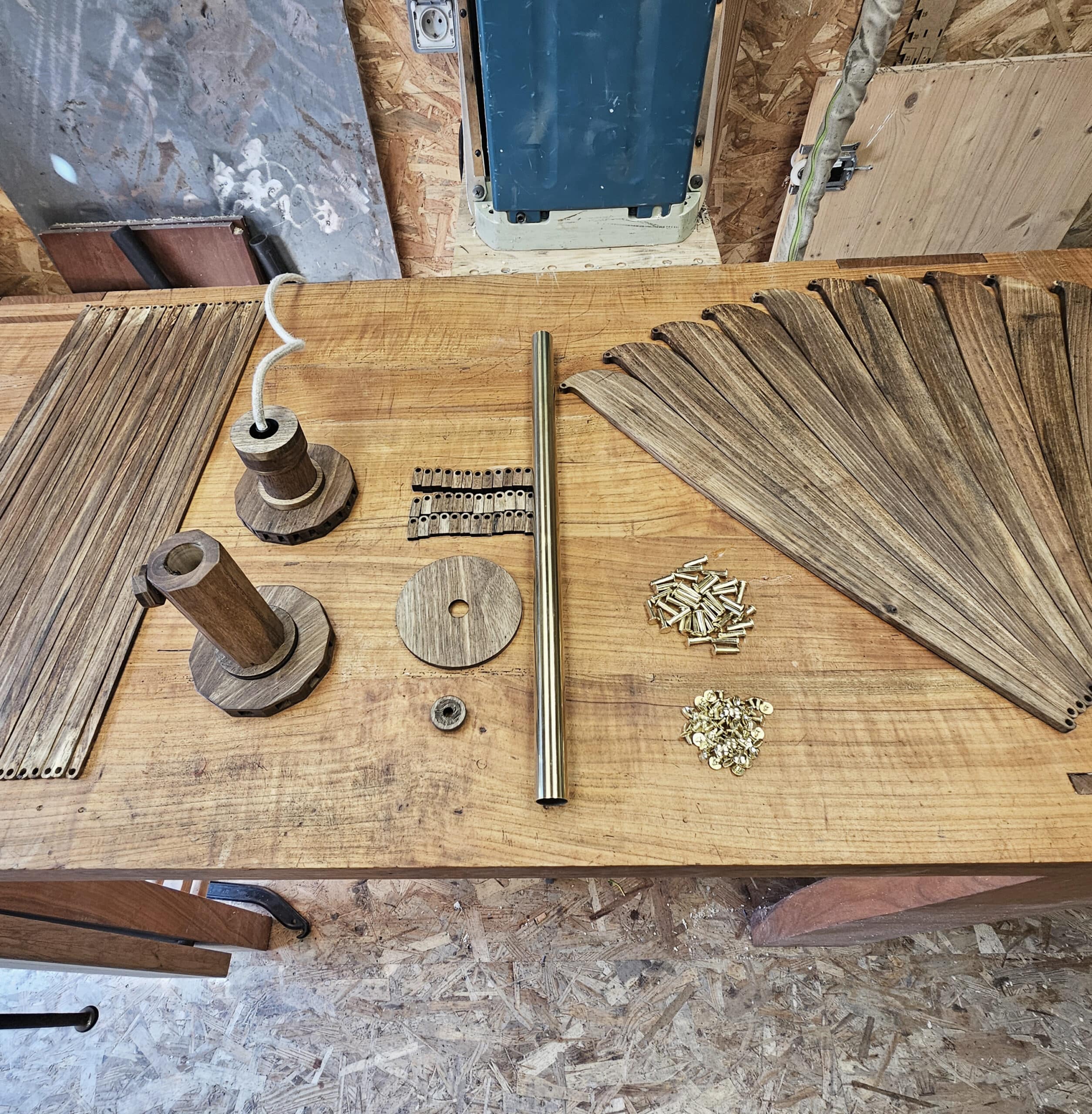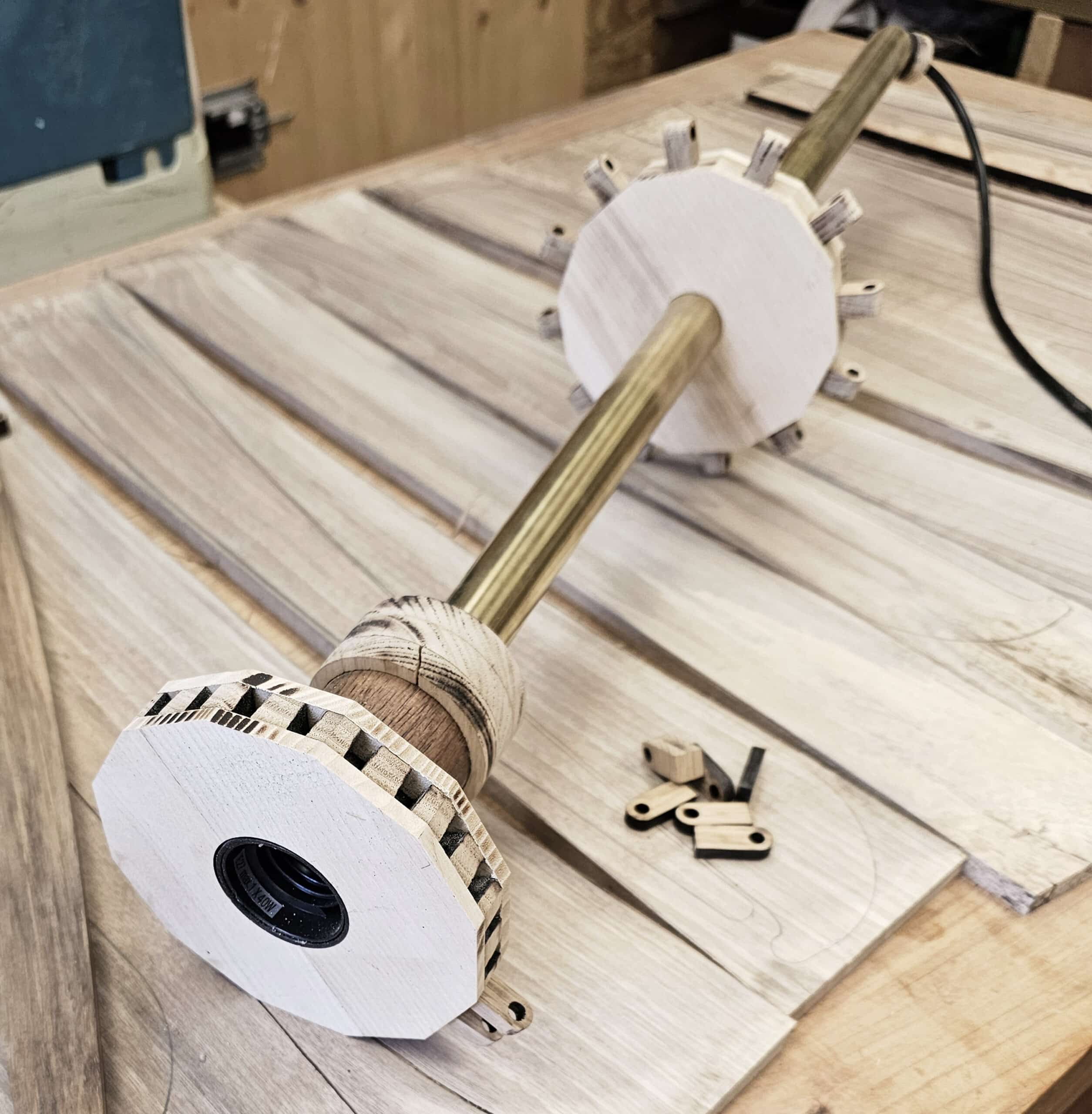 Après réflexion, nous décidons d’avoir une structure en métal vieilli pour la légèreté, le lustre en balance avec son contre-poid en céramique pour l’équilibre et un socle en chêne massif pour l’élégance.
